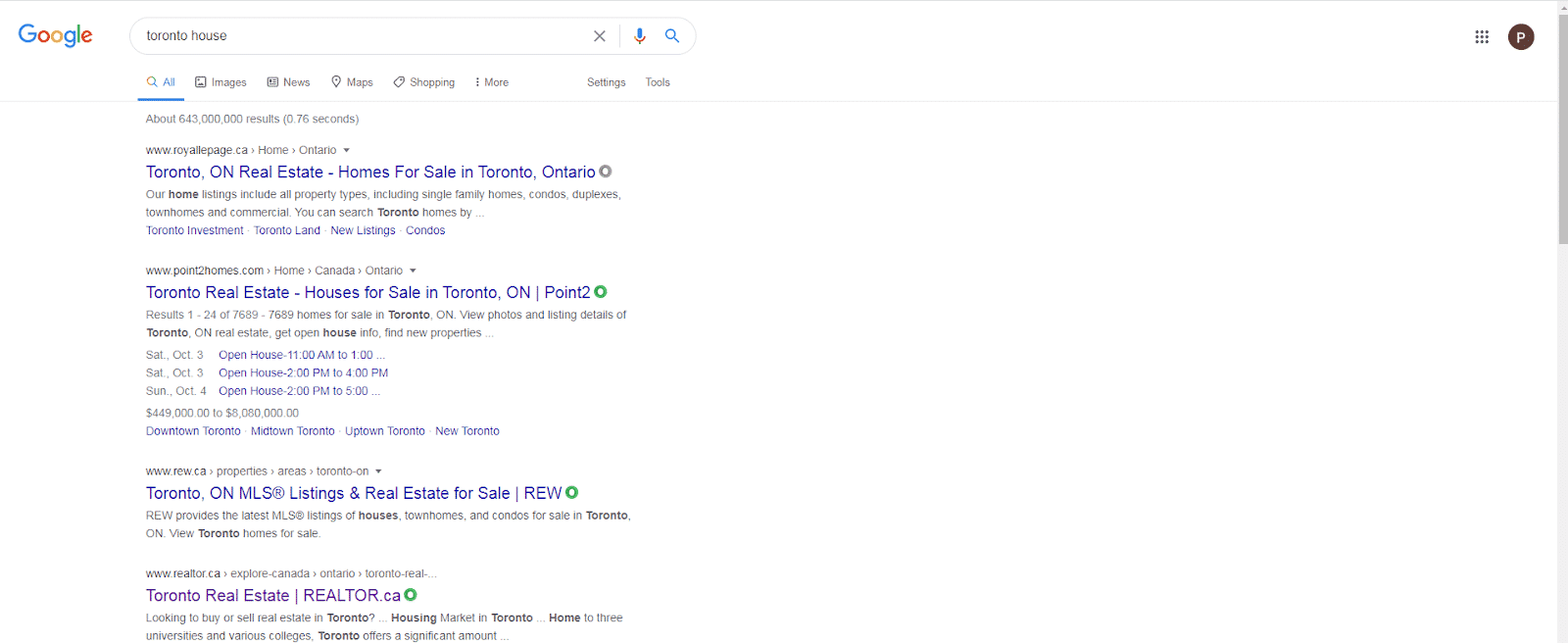 All of the top results are about real estate. That’s because Google knows if we’re looking up house + location, it’s much more likely we’re looking to buy a house. As you can imagine, when we get more specific about location (like “house in East York”), we’ll get real estate results specific to East York. This is keyword research - you figure out what search terms people are using when they intend to buy homes in your area, and you try to rank highly (show up in the top search results) for those terms.