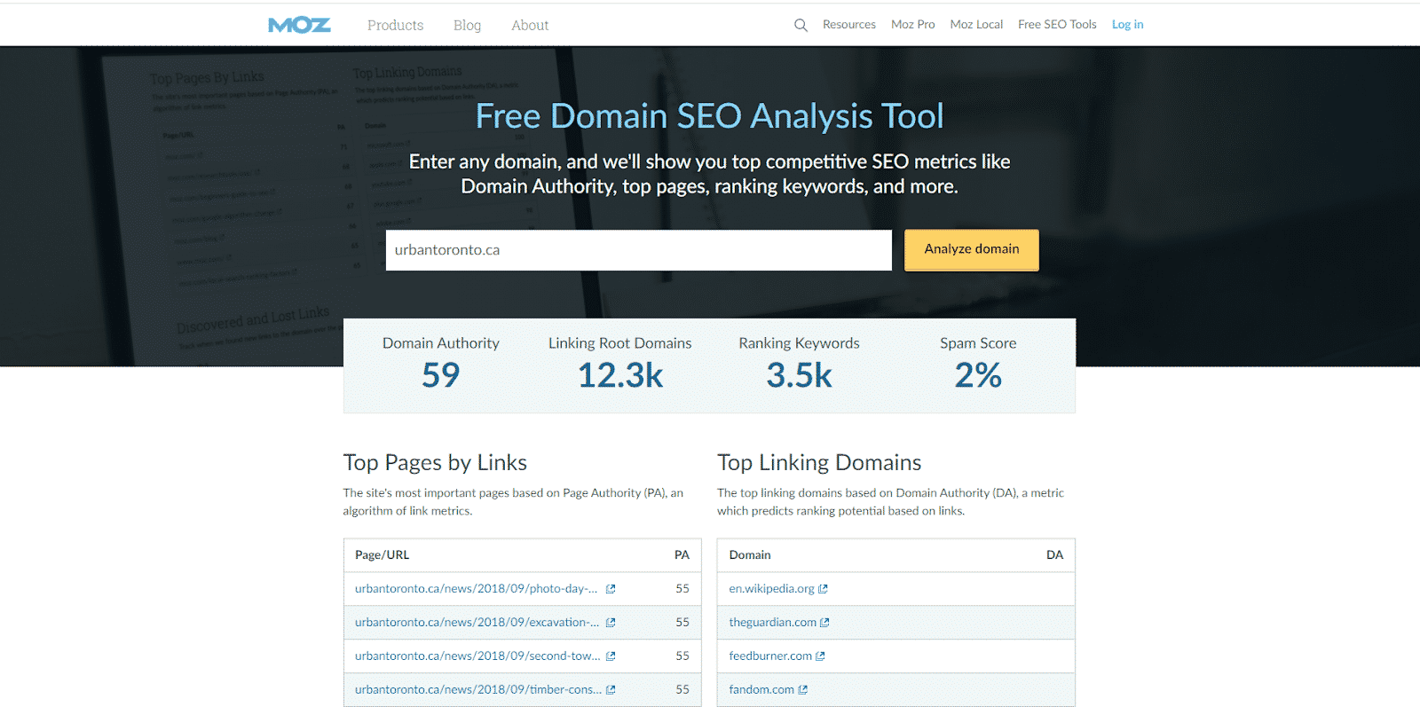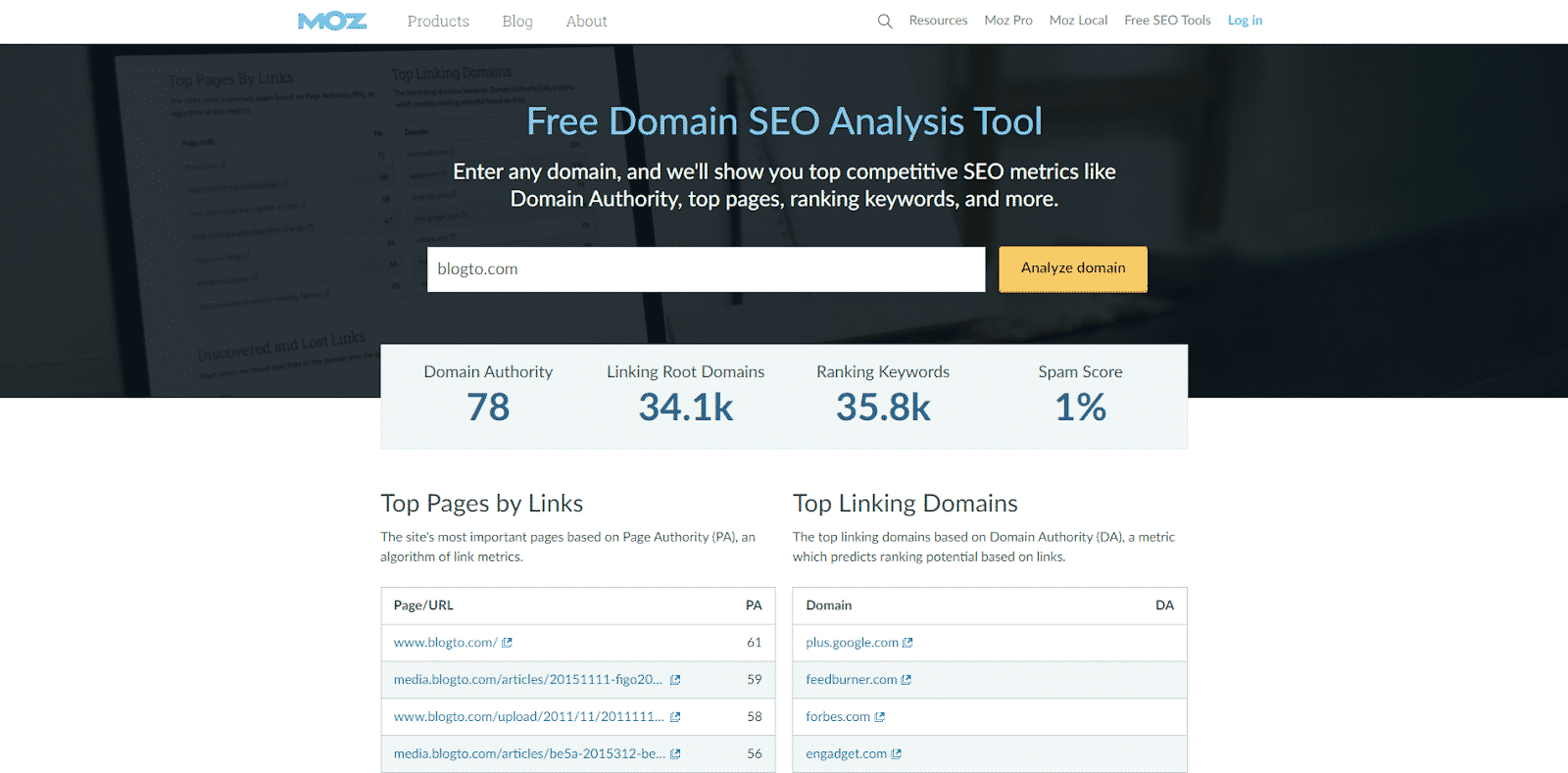 First, blogTO, a site you’re likely familiar with. Let’s do our Moz domain analysis: