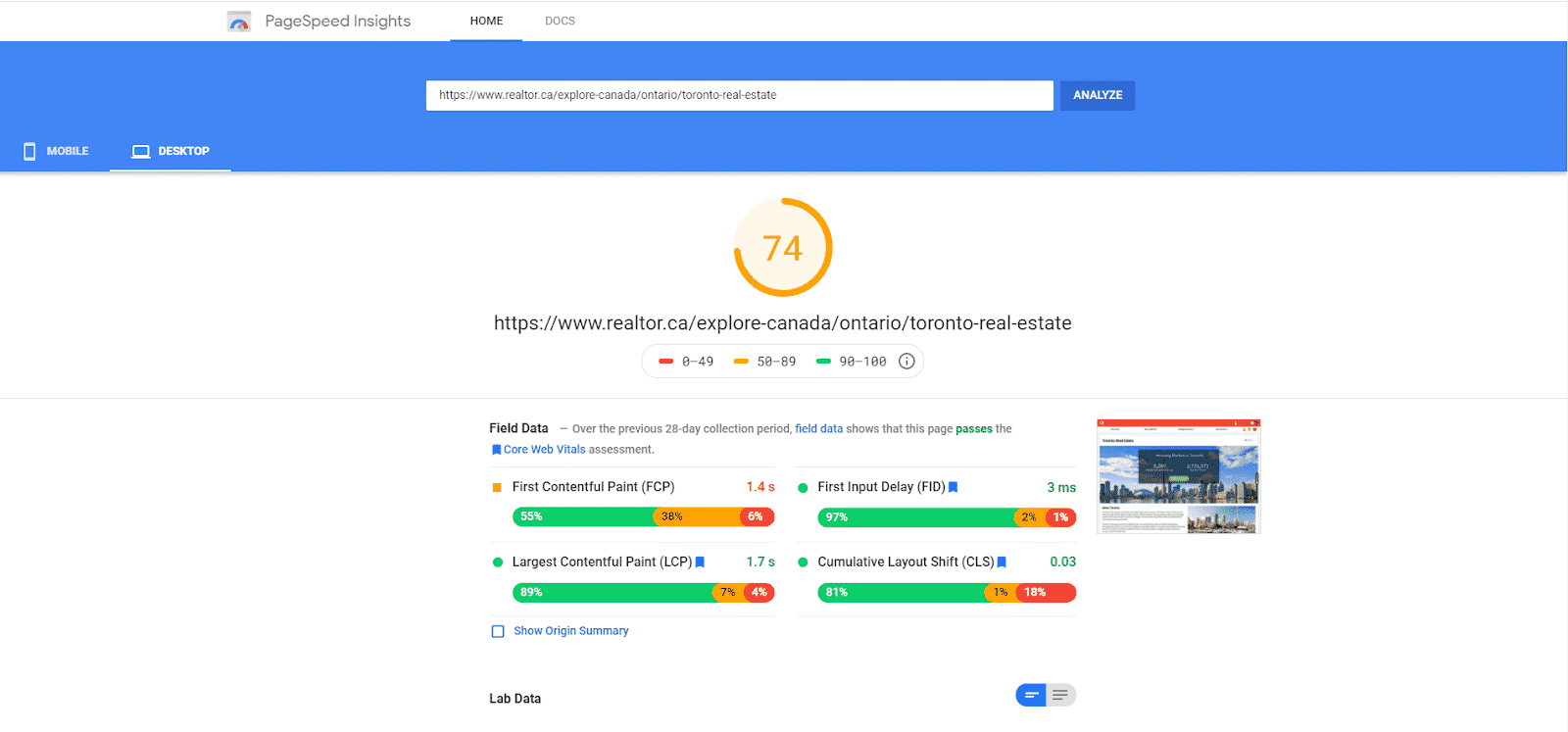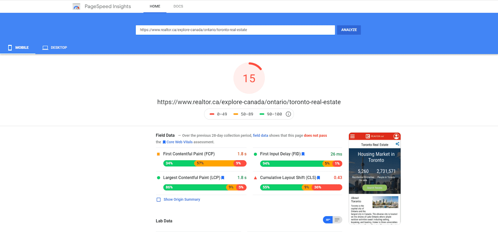 Look at the difference in those scores! Honestly, our friends at REALTOR® have made quite a big mistake here - their website is not well-optimized for mobile at all. Don’t make the same mistake - make sure your website is responsive and loads quickly on mobile devices.