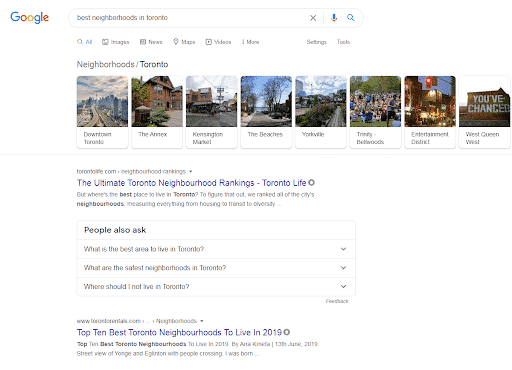 You’ve picked out some keywords you want to rank for. Let’s say one of them is “best neighbourhoods in Toronto”. We get the following results from Google:
