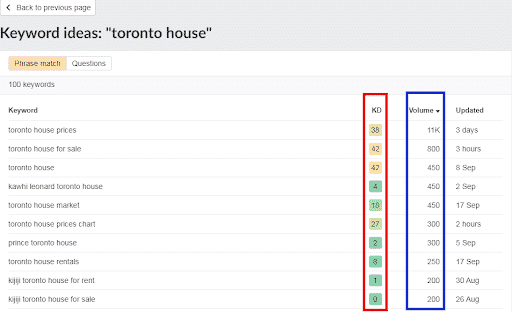 Of course, you’ll also want to find keywords that are relevant. The term “prince toronto house” has a great KD/volume ratio, but it has almost nothing to do with real estate. You might still be able to use it to your advantage, though - more on that in the “Content” section.