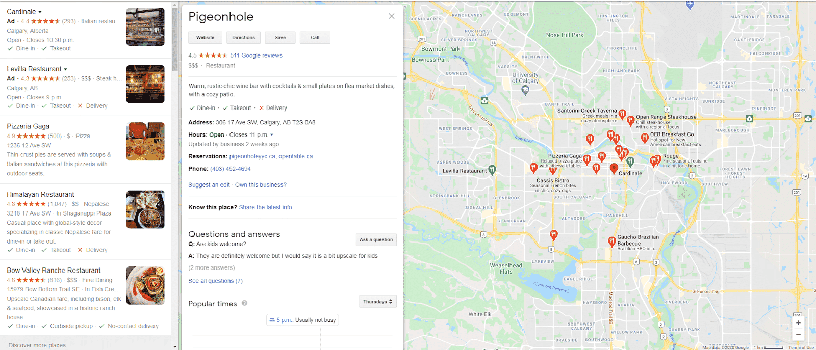 It’s a thing of beauty. A whole list of restaurants throughout Calgary, and a much more detailed description of the restaurant we selected (Pigeonhole). Call-to-actions, including a button to call the restaurant. A brief description of the restaurant. A question-and-answers section (and below it, a Review section, which we’ll touch on later). It’s basically a giant ad for Pigeonhole.