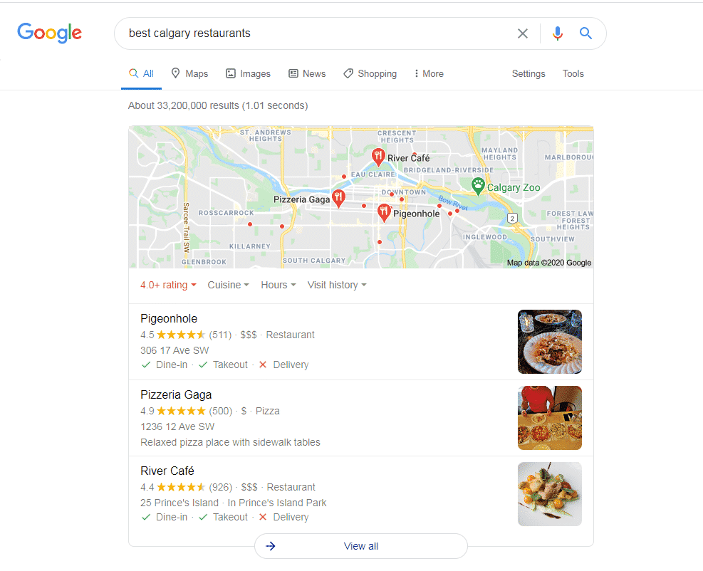 Imagine I’m new to Calgary, and I want to find some nice places to eat. I decide to look up “best calgary restaurants” on Google. Here’s what I’m greeted with: