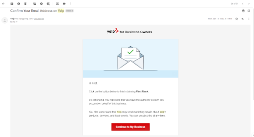 From here, Yelp will send you an email confirmation. Check your inbox. The page should look like this: