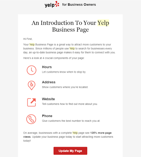 Once you’ve confirmed your email, you should (within moments or days) receive an email like this from Yelp: