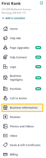 Click on that “Update My Page” button, and update the information accordingly. You’ll also be able to update all of this information in the Business Information tab of the Yelp profile for your business: