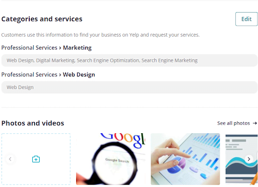 There’s a lot more you can do with your Yelp profile. You’ll want to add images, as well as add services to the categories you’ve chosen for your business.