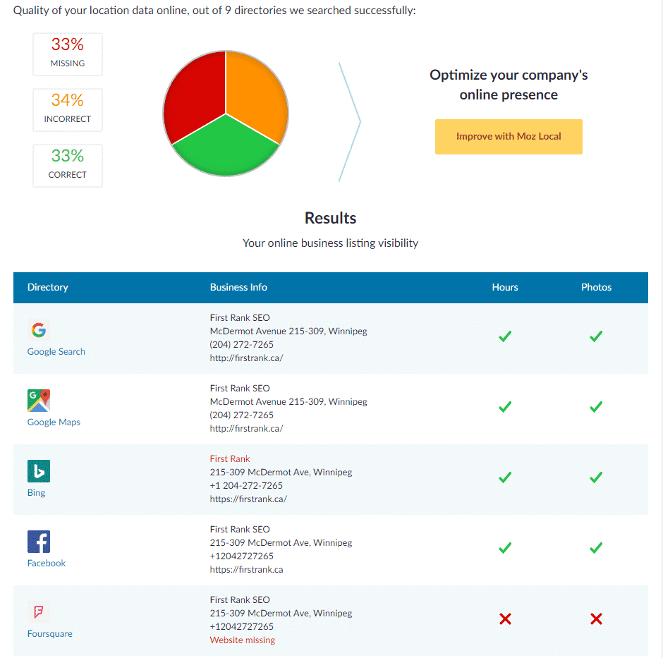 You can see that we’re missing results on some of what Moz considers to be important aggregators, that we can add a website to our Foursquare page, and that we can edit our name on Bing. These are very easy wins. You can see that even the slightest difference in the name will be flagged as incorrect - you need to keep your NAP citations consistent across all platforms.