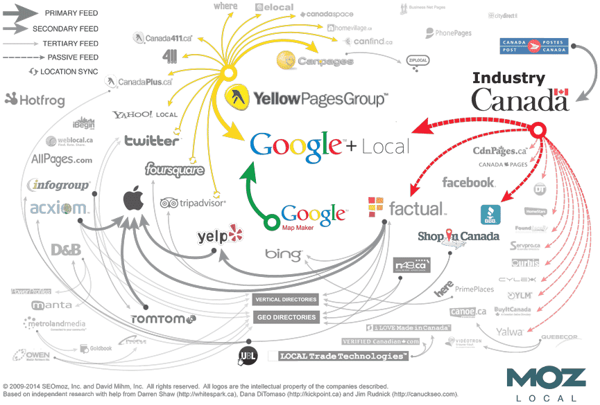 Moz has a detailed post about the Canadian local search ecosystem. In it, we can see that Yellow Pages Group (YPG) is an absolutely central player in the ecosystem: